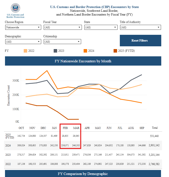 Al revisar los datos de la Oficina de Aduanas y Protección Fronteriza (CBP, por sus siglas en inglés) se observa que en febrero y marzo, los dos primeros meses de administración Trump, se detuvieron a 57,700 personas en las fronteras terrestres, marítimas, áreas y otros de los Estados Unidos. Esa cifra representa una reducción del 88.5% con respecto a los 502.576 en esos mismos meses en 2024.