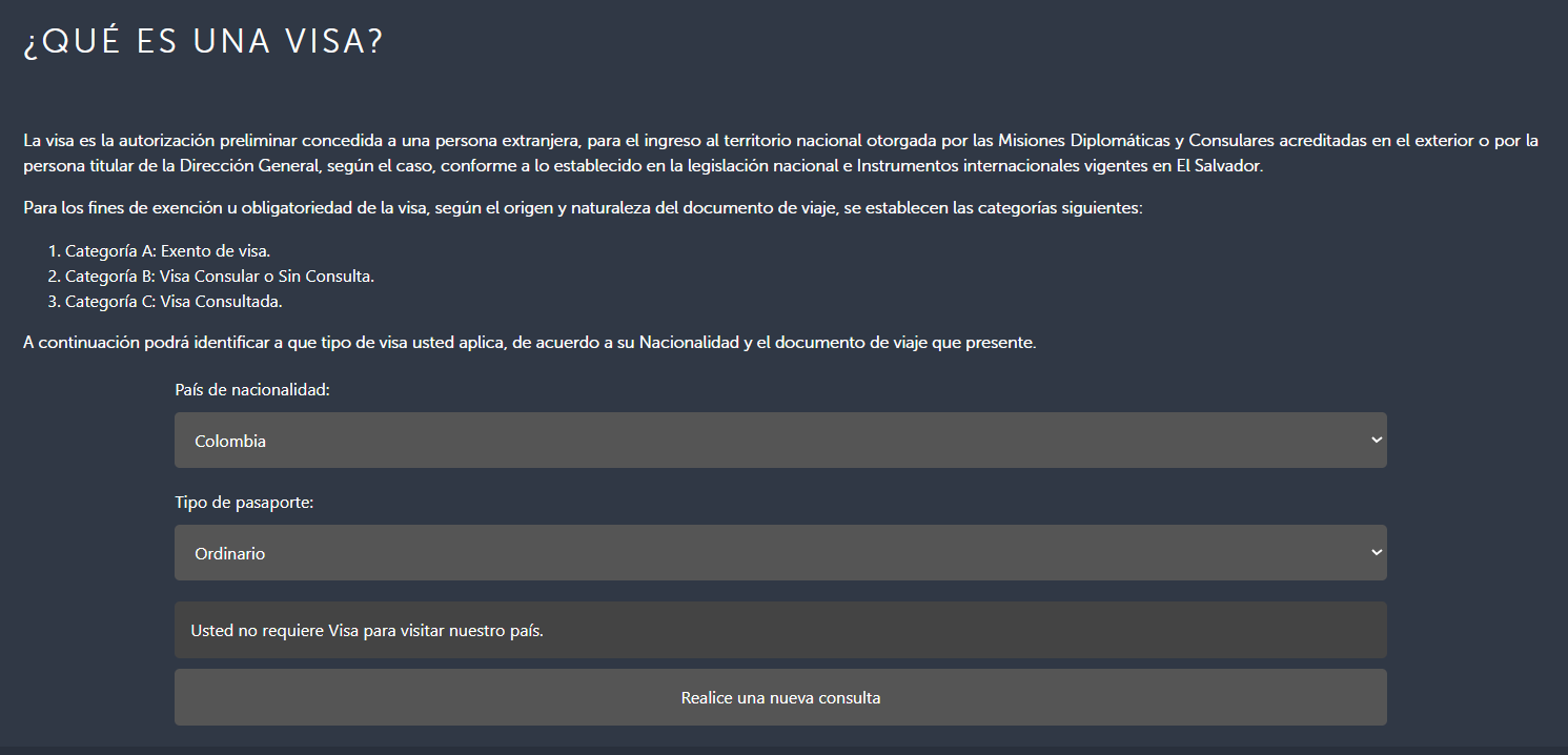 Los colombianos y ecuatorianos no necesitan visa para entrar a El Salvador, no así los venezolanos, que sí la requieren. “Las personas de origen colombiano solo deben presentar su pasaporte vigente y los documentos que comprueben el motivo de su viaje. Por ser colombiano, no necesitan hacer trámites de visa, están exentos”, respondió una responsable que brinda información de la DGME, consultada por teléfono. Con respecto a si las “reglas” o leyes han cambiado, como le dijeron a la protagonista de esta historia, añadió que “esa información, siempre y cuando no se (haya) publicado, no tiene fundamentos. Cuando se haga un cambio en la ley se va a notificar previamente”.