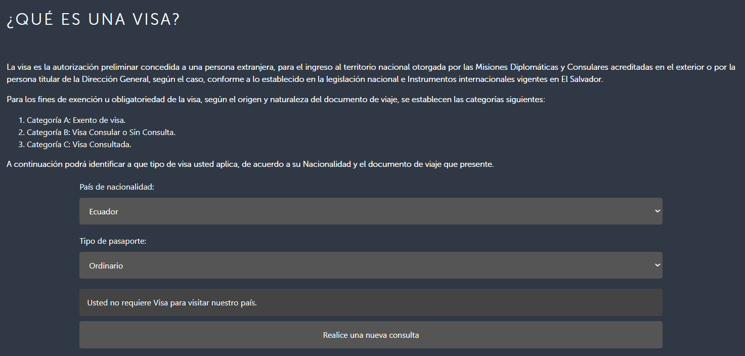 Los consulados en Ecuador y Colombia en San Salvador, consultados vía correo electrónico, descartaron cualquier necesidad de visa de sus ciudadanos para entrar al país. “Siendo ecuatoriano y portando su pasaporte ordinario puede ingresar a este país hasta por 90 días por motivo de turismo. Procure tener a la mano información de su hospedaje y demuestre solvencia para el tiempo de estadía en este país. (Para) mayor información recurra a fuentes oficiales de la Cancillería salvadoreña”, respondió la sección consular de Ecuador en San Salvador, vía correo electrónico.