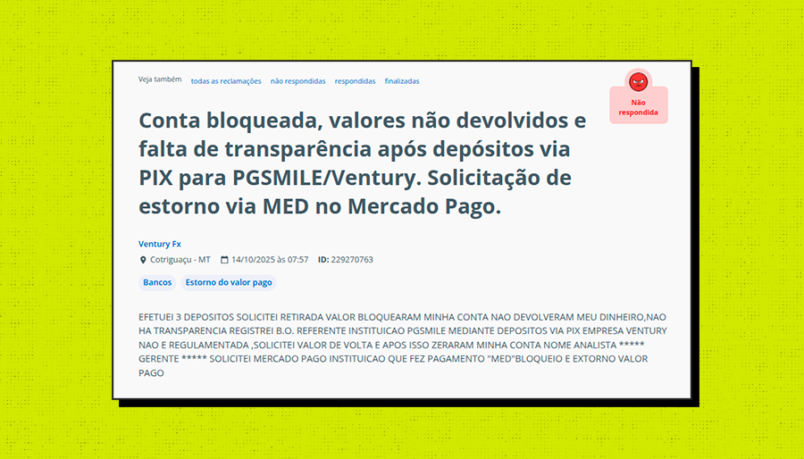 En uno de los casos investigados por el reportaje, otro inversionista del estado de Mato Grosso cuenta que hizo tres depósitos vía Pix para VenturyFX y que, después de solicitar el retiro del valor invertido, su cuenta fue bloqueada.