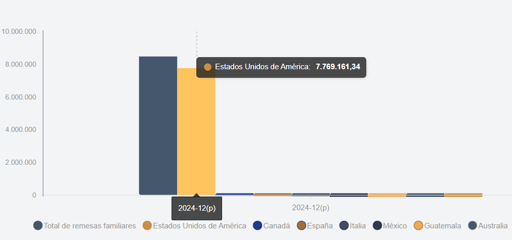 Además, al tomar en cuenta el envío de remesas se observa que el 91.6% llegó de los Estados Unidos en 2024. En concreto, $7,769 millones de los $8,479 millones. Canadá y España le seguían esa estadística del Banco Central de Reserva (BCR).