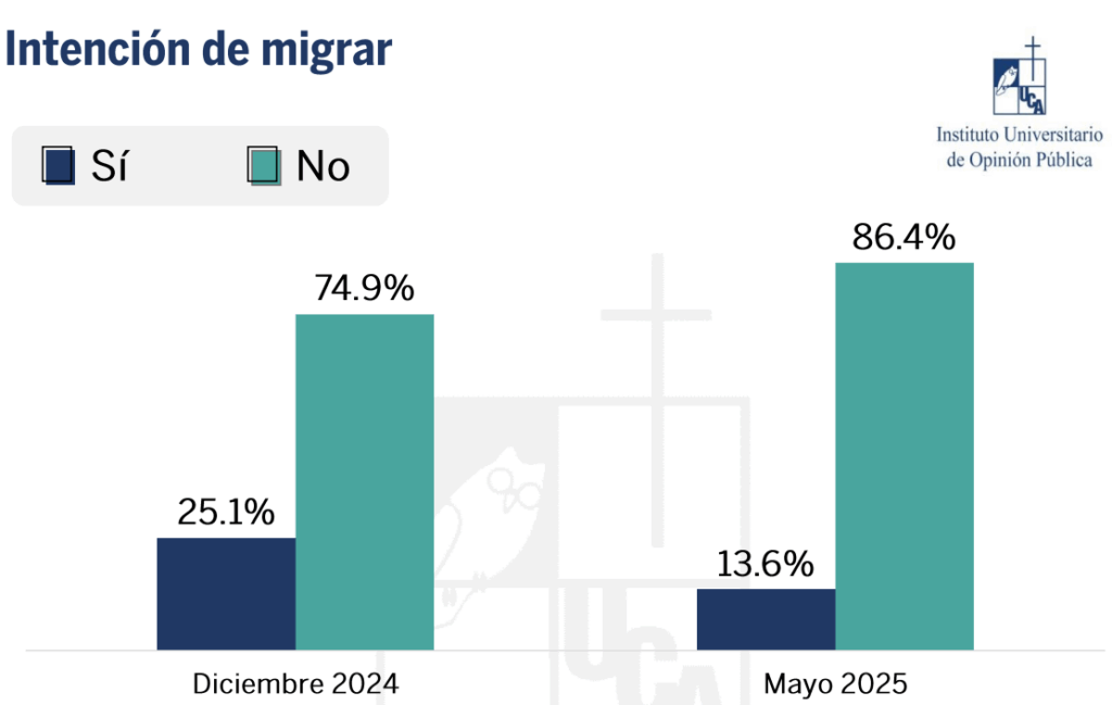 Una situación similar se observa en la última encuesta del Instituto Universitario de Opinión Pública (Iudop) de la UCA sobre la evaluación del sexto año del presidente Nayib Bukele, publicada en junio de este año. La intención de migrar cayó del 25.1% en diciembre de 2024 a 13.6% en mayo de 2025.