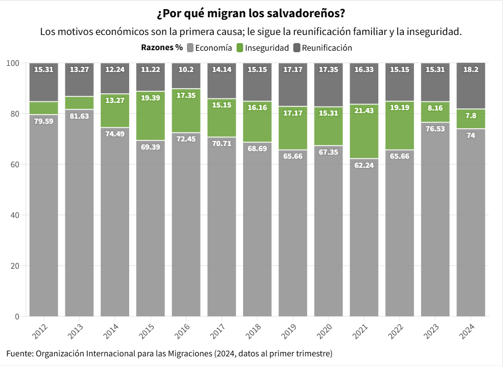 Por supuesto, la mejora en la seguridad tiene un impacto positivo, pero no hay que olvidar que es la situación económica (pobreza, falta de empleo, canasta básica,…) la principal razón por la que los salvadoreños abandonan el país. Así lo reflejan las encuestas que las autoridades migratorias hacen a los retornados, donde se les pregunta por los motivos que les llevaron a salir. Entre el 60% y 80% de los encuestados entre 2012 y 2024 respondieron el asunto económico. Le siguen la inseguridad y la reunificación familiar. En los últimos dos años, el tema de la inseguridad ha caído al tercer lugar.