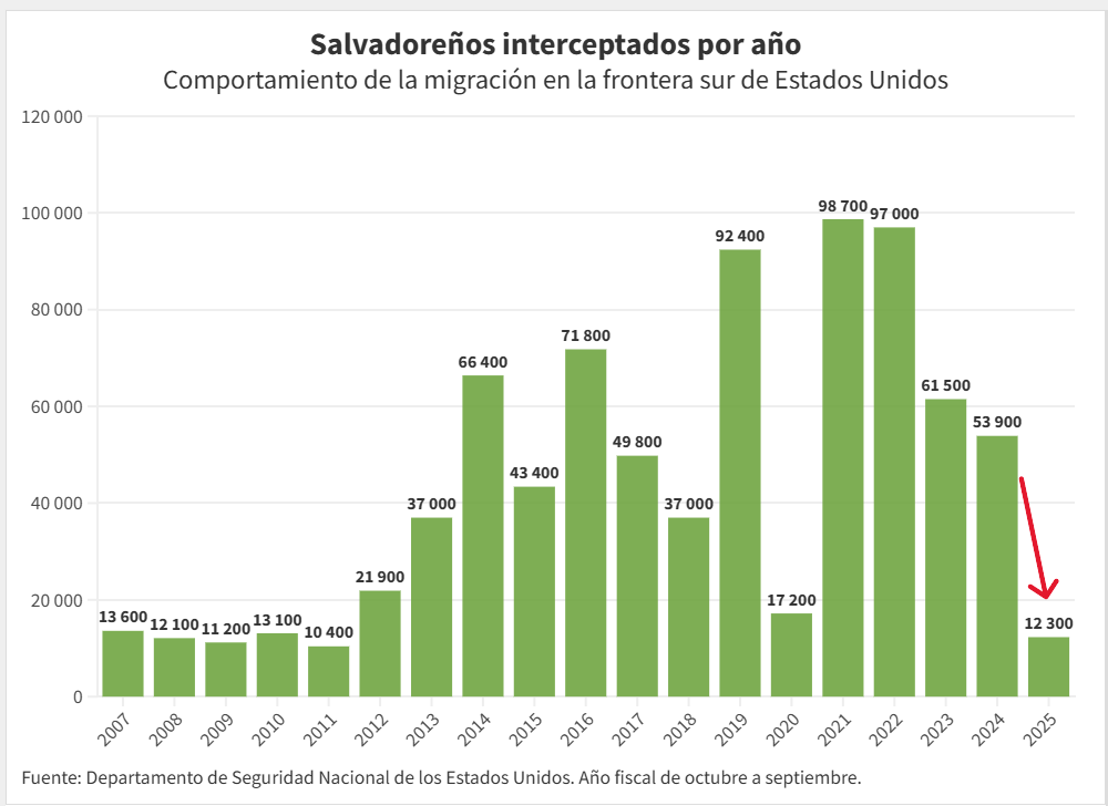 En efecto, los salvadoreños representaron el 2.76% del total de migrantes interceptados (encuentros) en la frontera sur de los Estados Unidos en el año fiscal 2025. Hace 10 años, como compara la funcionaria, ese porcentaje fue en torno al 14%. En 2014 hubo 66,000 detenidos y en 2015, 43,000.