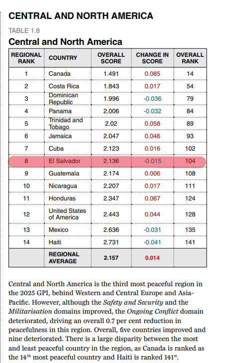El Salvador se ubicó en la posición 104 de 163 estados y territorios en el informe publicado a mitad de este año. Mejoró una posición con respecto al estudio de 2024, año en que sobresalió al escalar 21 peldaños. “La percepción de la criminalidad mejoró en 96 países, siendo El Salvador el que registró la mayor mejora (…)”, decía el informe entonces. Sin salir del istmo, Costa Rica (54) y Panamá (84) están mejor que El Salvador.