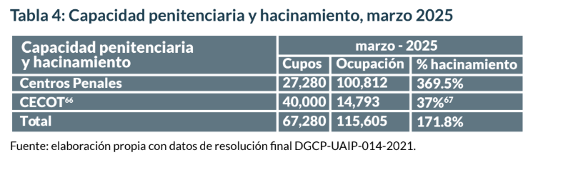 El informe de Fespad estima un hacinamiento del 369% en promedio en los centros penitenciarios salvo el Cecot cuyas instalaciones tienen espacio de sobra para albergar a más personas.