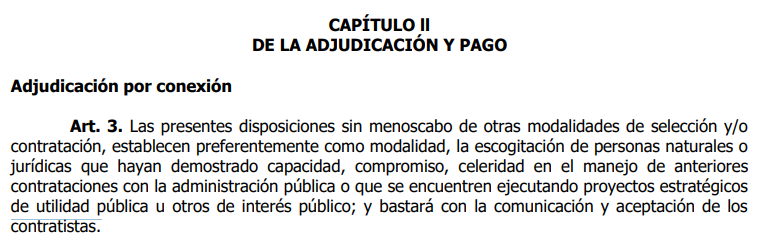 Desde Acción Ciudadana, una organización que trabaja en contraloría social, se enumeran algunos riesgos que pueden implicar estas contrataciones: sobrecostos al dar una obra por afinidad y no por capacidad, que el dinero público se concentre en pocas manos, mala ejecución al escoger a una empresa solo por obras pasadas, entre otros. También, critica la discrecionalidad con la que se aplica lo relativo a la urgencia que acompaña a este tipo de decretos.
