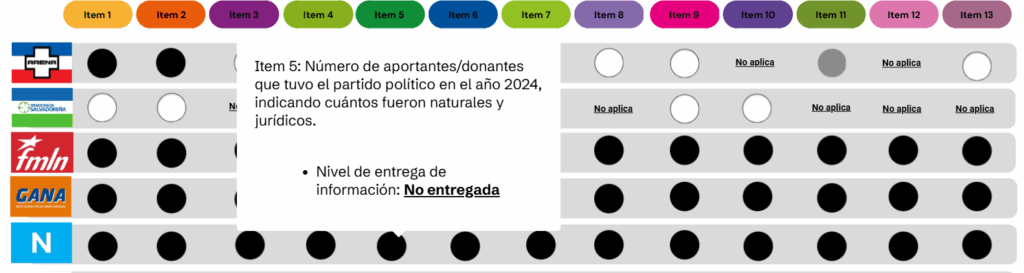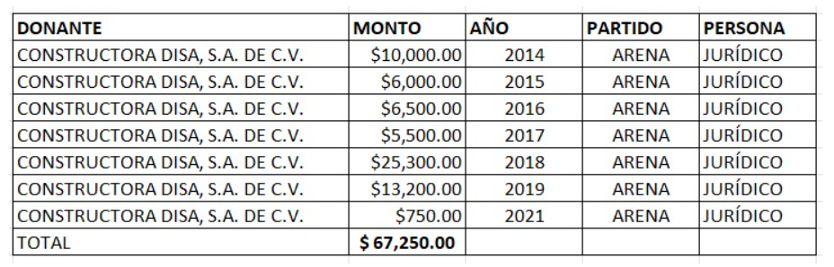 La organización Acción Ciudadana indica que Constructora Disa fue donante del partido Arena entre los 2014 y 2021, periodo en el que entregó $67,250, según su base de datos, alimentada de la información que proporcionó ese partido. Otros, en cambio, como Nuevas Ideas, Gana y FMLN se han negado a informar de sus donantes en los últimos años.