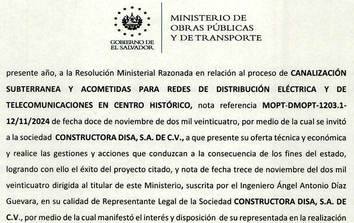 El Ministerio de Obras Públicas (MOP) contrató a la empresa Constructora Díaz Sánchez S.A de C.V. (Constructora Disa) para los trabajos de canalización subterránea y acometidas de redes eléctricas y de telecomunicaciones en el Centro Histórico de San Salvador por un monto de $3,887,769. La información está disponible en el contrato No. DL-849-28/2024 del 22 de noviembre de 2024, al que Voz Pública tuvo acceso.
