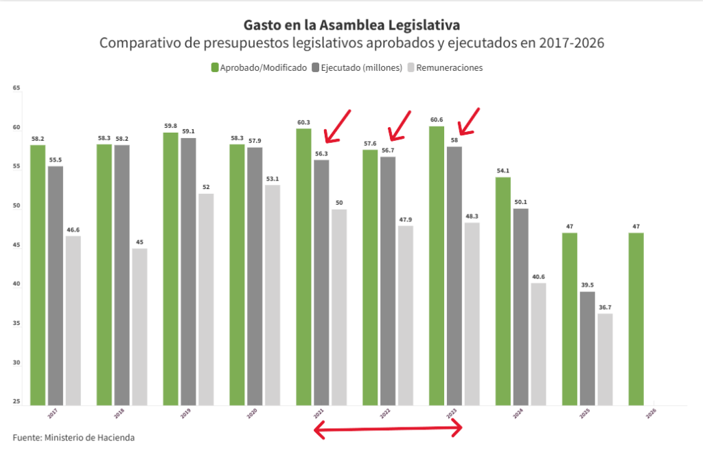 En los primeros días de mayo de 2021, Castro se comprometió con una serie de medidas para ahorrar $7 millones en bienes que eran totalmente prescindibles como teléfonos, vehículos de lujo y bonos. Más allá de si cumplió o no con ese compromiso, lo cierto es que la Asamblea Legislativa gastó más en los años siguientes que en el propio 2021.