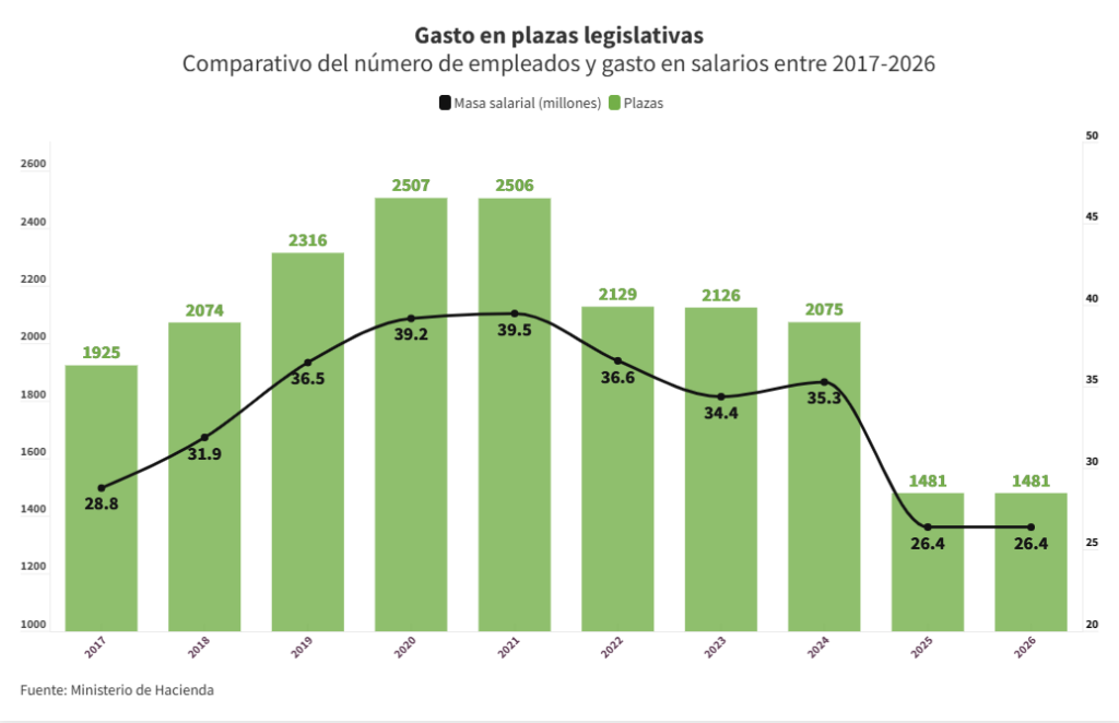 Al revisar el presupuesto se observa una reducción de 1,025 plazas entre 2021 y 2025. Ahora bien, entre 600 y 650 se eliminaron en el propio 2025, el primer año con un presupuesto confeccionado para 60 diputados en lugar de 84. En general, las plazas eran de legisladores propietarios y suplentes, personal asignado y otros. Las restantes se eliminaron del presupuesto en 2022, el primero con Ernesto Castro al frente de la Asamblea. En los dos años siguientes, se mantuvieron igual. De hecho, en 2024 se incrementó en casi un millón la asignación de salarios a pesar de tener menos vacantes.