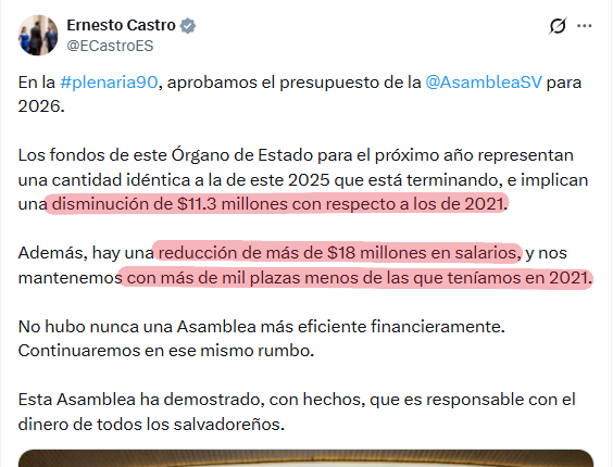El diputado de Nuevas Ideas se había referido al mismo asunto en un tuit el 18 de diciembre cuando se aprobó el presupuesto general para 2026. “Los fondos de este Órgano de Estado (…) implican una disminución de $11.3 millones con respecto a los de 2021. Además, hay una reducción de más de $18 millones en salarios, y nos mantenemos con más de mil plazas menos de las que teníamos en 2021”, decía una parte del contenido.