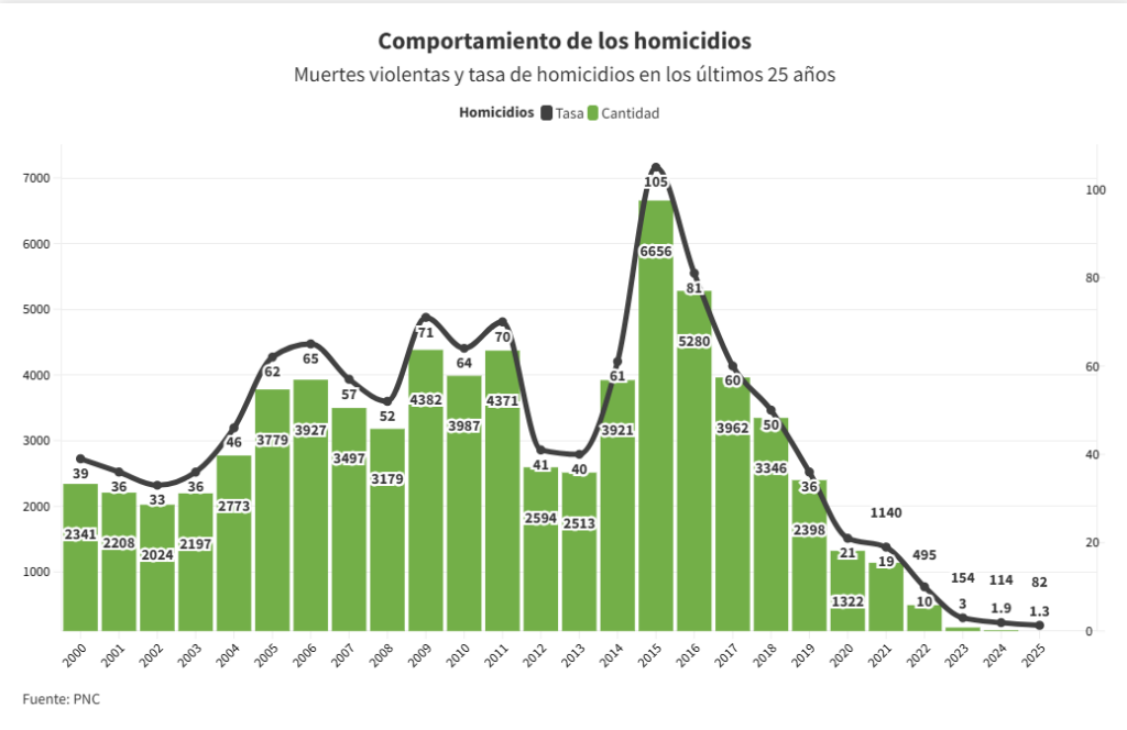 El Salvador cerró el año 2025 con 82 homicidios y una tasa de 1.3 muertes violentas por cada 100,000 habitantes. Es conocido que el dato oficial tiene un subregistro de origen al no incluir las muertes violentas en las cárceles, osamentas halladas en predios baldíos y a los presuntos delincuentes que mueren en enfrentamientos con las autoridades.
