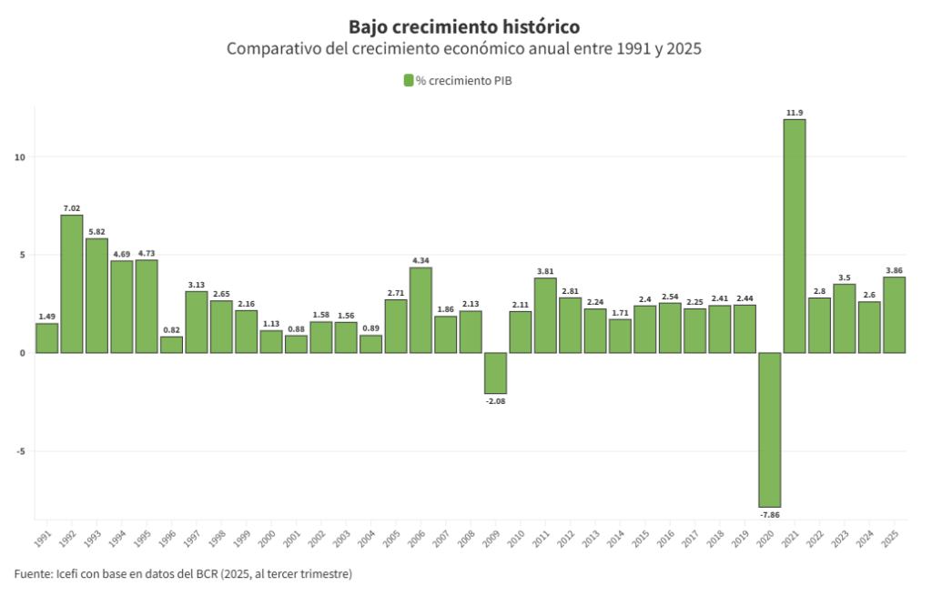 Las cifras del crecimiento económico que menciona Ulloa no son ciertas. En primer lugar, da por hecho que el país creció un 4% en 2025 cuando el BCR publicará el dato a finales de marzo. En general, instituciones internacionales y economistas consultados esperan un crecimiento que oscila entre el 3.5 y el 4%.