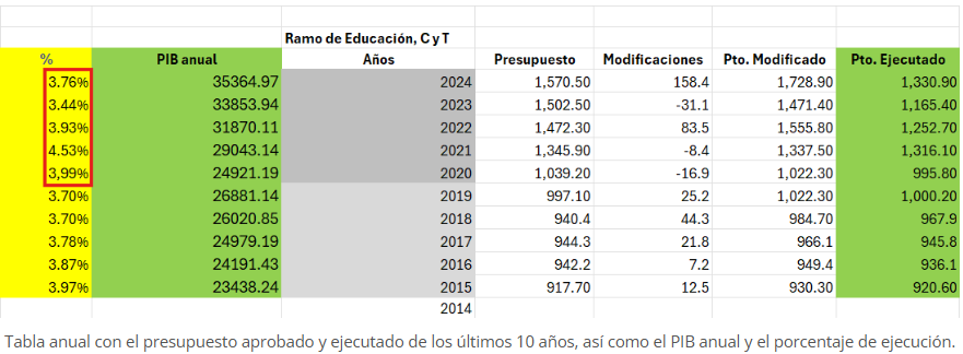 El primer quinquenio de Bukele promedió un 3.92% del PIB de inversión en la enseñanza con un máximo del 4.53% en 2021 y un mínimo de 3.44% en 2023. Este cálculo resulta al dividir el presupuesto ejecutado por el Ministerio de Educación entre el PIB a precios corrientes de cada año. La estadística del presidente toma en cuenta el presupuesto aprobado, pero eso tiene trampa. Educación dejó sin ejecutar $211 millones en promedio cada año en el quinquenio, casi todo en el área de infraestructura. Hubo períodos como el 2024 que fueron $398 millones lo que no se utilizaron del presupuesto.