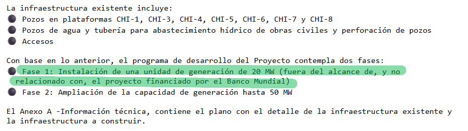 El Estudio de Impacto Ambiental y Social (EIAS) del proyecto “Desarrollo del campo geotérmico de Chinameca”, elaborado por la firma RINA Consulting, Inc. de Washington, D.C., contratada por LaGeo, especifica que la fase 1 del proyecto (adjudicada a InterEnergy) no tiene que ver con el financiamiento aprobado. “Fase 1: Instalación de una unidad de generación de 20 MW (fuera del alcance de, y no relacionado con, el proyecto financiado por el Banco Mundial)”, se indica en la página 34. Las únicas obras vinculadas con la fase 2 y, por tanto, con el financiamiento del banco son la línea de transmisión y la subestación eléctrica. LaGeo es una empresa subsidiaria de la CEL que se dedica a la producción de electricidad a partir del recurso geotérmico.