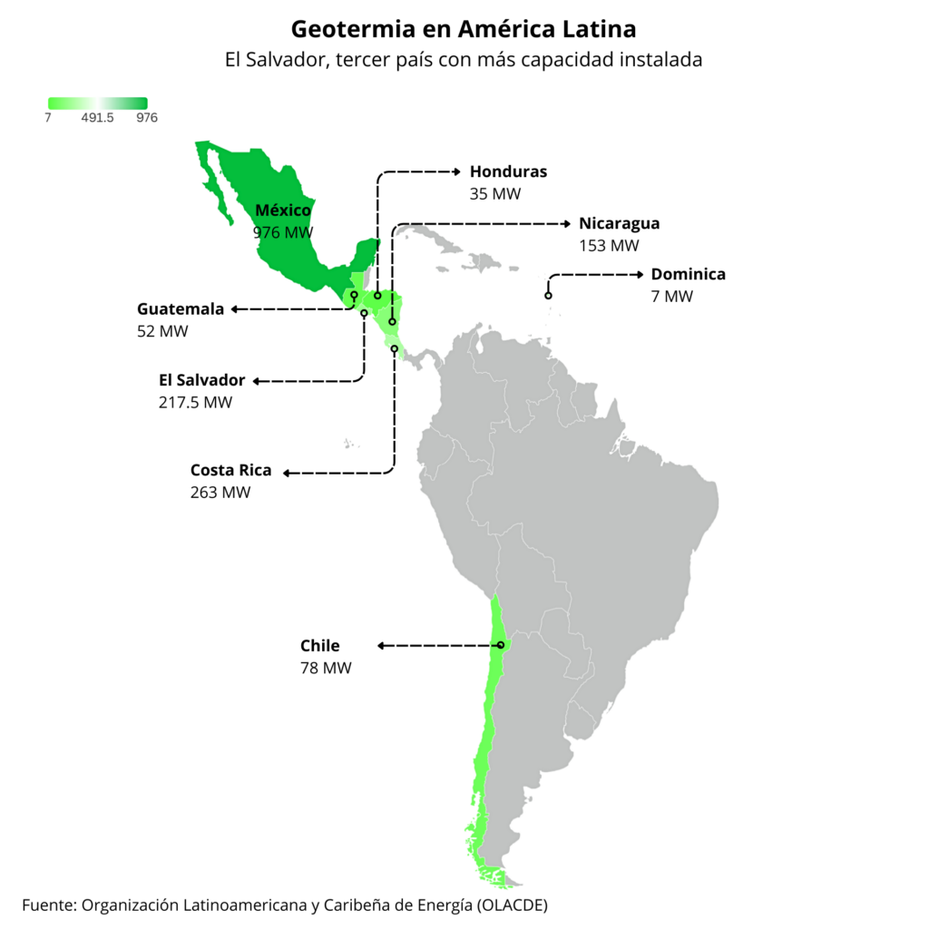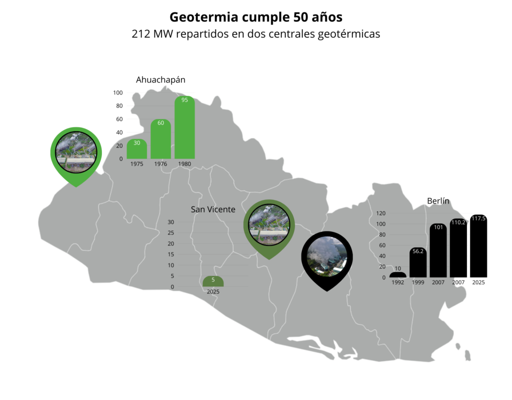 En cambio, El Salvador tiene una trayectoria de 50 años y es un alumno aventajado en el contexto latinoamericano. Su capacidad instalada es de 217 MW repartidos en las dos centrales geotérmicas de Ahuachapán (95 MW) y Berlín (117 MW), además de los mencionados 5 MW de San Vicente. Su potencial de generación representa el 12% del ámbito regional, solo superado por México (51%) y Costa Rica (17%).