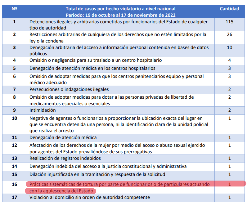 Una investigación de la Alianza Periodística Intermedios (API) reveló que, durante ese lapso de tiempo, la PDDH recibió 22 denuncias de tortura y más de 2,000 violaciones a los derechos humanos presentadas por víctimas del régimen de excepción o sus familiares. De esas 22 denuncias, 11 corresponden a 2022, seis a 2023, cuatro a 2024 y una a 2025.