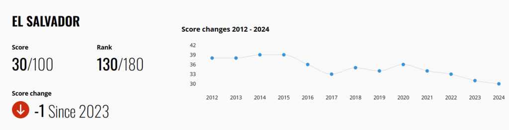 Informes internacionales sobre transparencia como el Índice de Percepción de la Corrupción (IPC) 2024 ubica a El Salvador en el puesto 130 de 180 países. Su puntaje es de 30 en una escala de 0 (el más corrupto) a 100 (muy transparente). En 2020 tenía 36 puntos y en 2015, 39. Transparencia Internacional, organización responsable del informe, destacó que en la actual gestión «se ha profundizado y normalizado el fenómeno de la corrupción».
